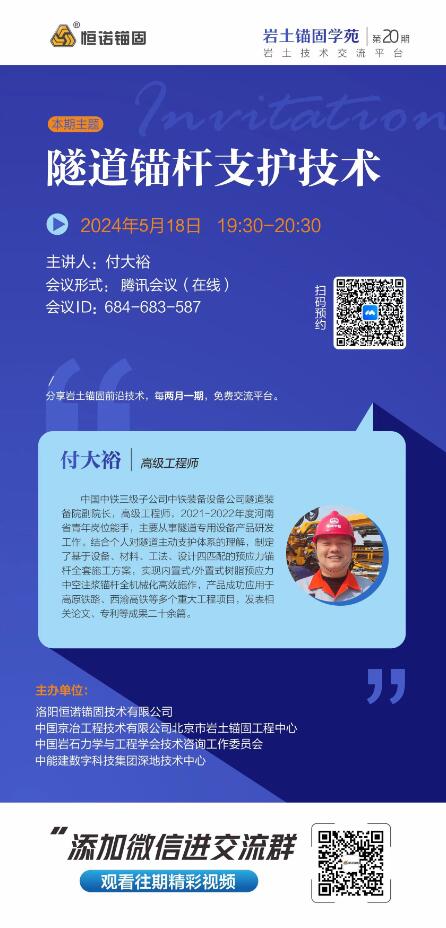 巖土錨固學苑將于2024年5月18日(周六)19:30-20:30舉辦第20期,本期主題:隧道錨桿支護技術,歡迎廣大巖土錨固領域愛好者參與交流。